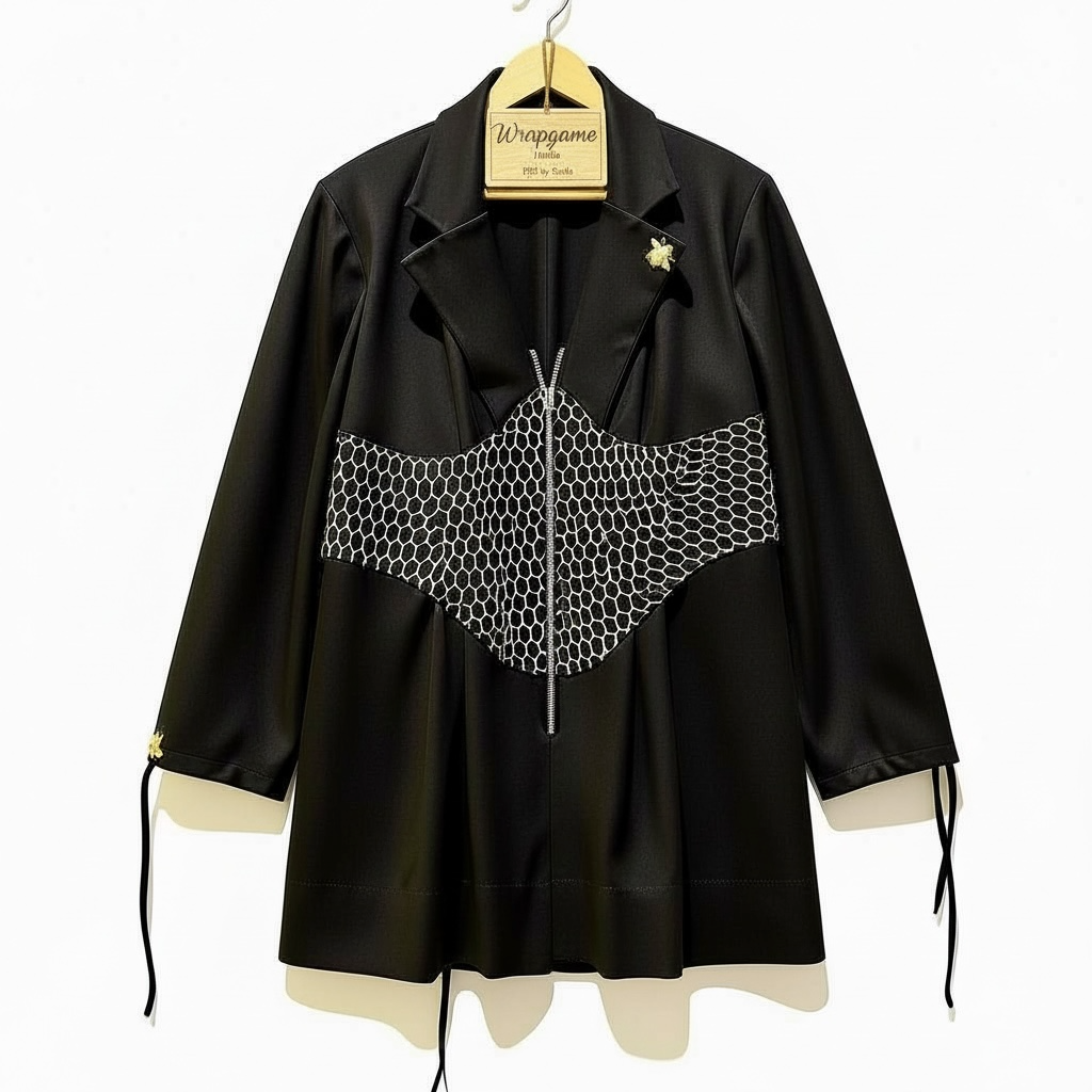 Intricately placed honeycomb embroidery runs across the silhouette, elevated with delicate bee motifs crafted on a brass base, adding a subtle bling touch that defines the Hive identity. The clean shift cut keeps the dress versatile and flattering, while the detailed surface work makes it a true statement piece.