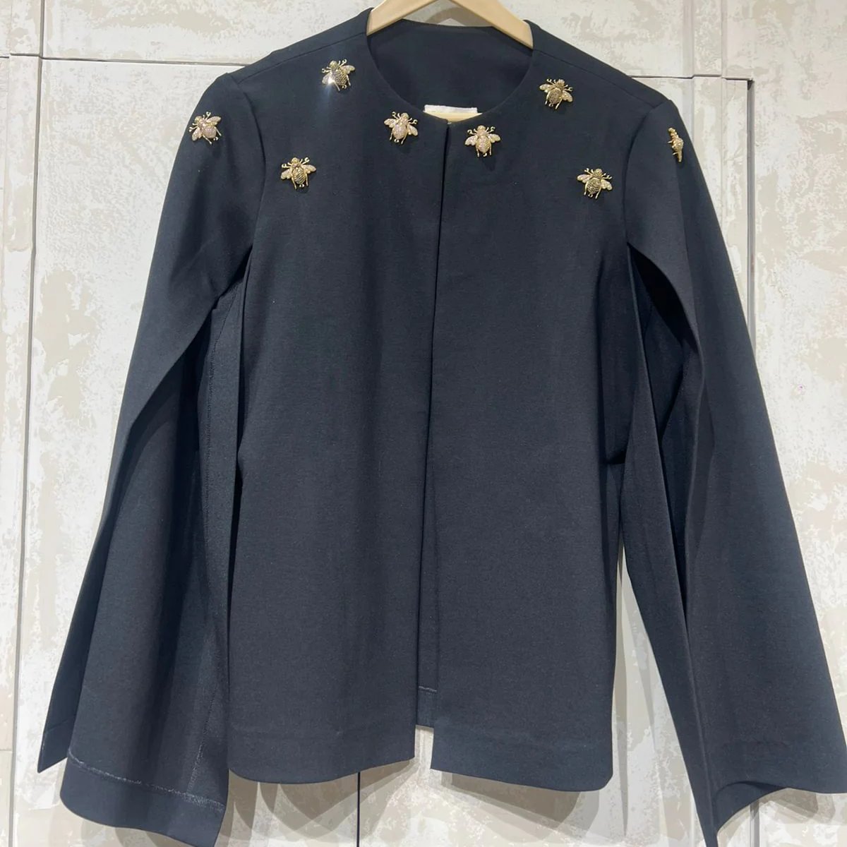 The clean shift cut keeps the cape versatile and flattering, while the Bee motifs makes it a true statement piece.
