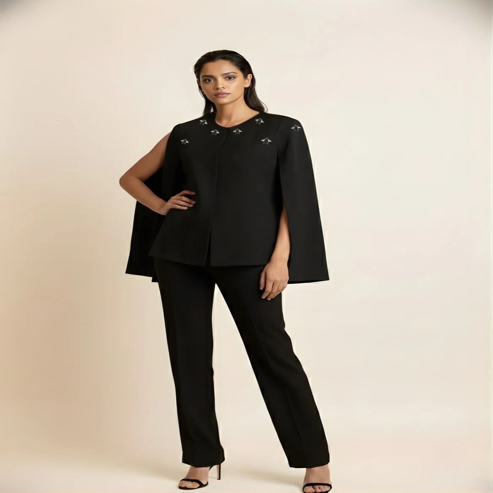 Crafted in a structured yet comfortable, stretchable winter-friendly fabric, the Hive Noir Cape is designed to hold its shape while offering effortless wear. The fabric has a smooth finish with a substantial hand-feel, making it ideal for cooler months without feeling heavy or restrictive.