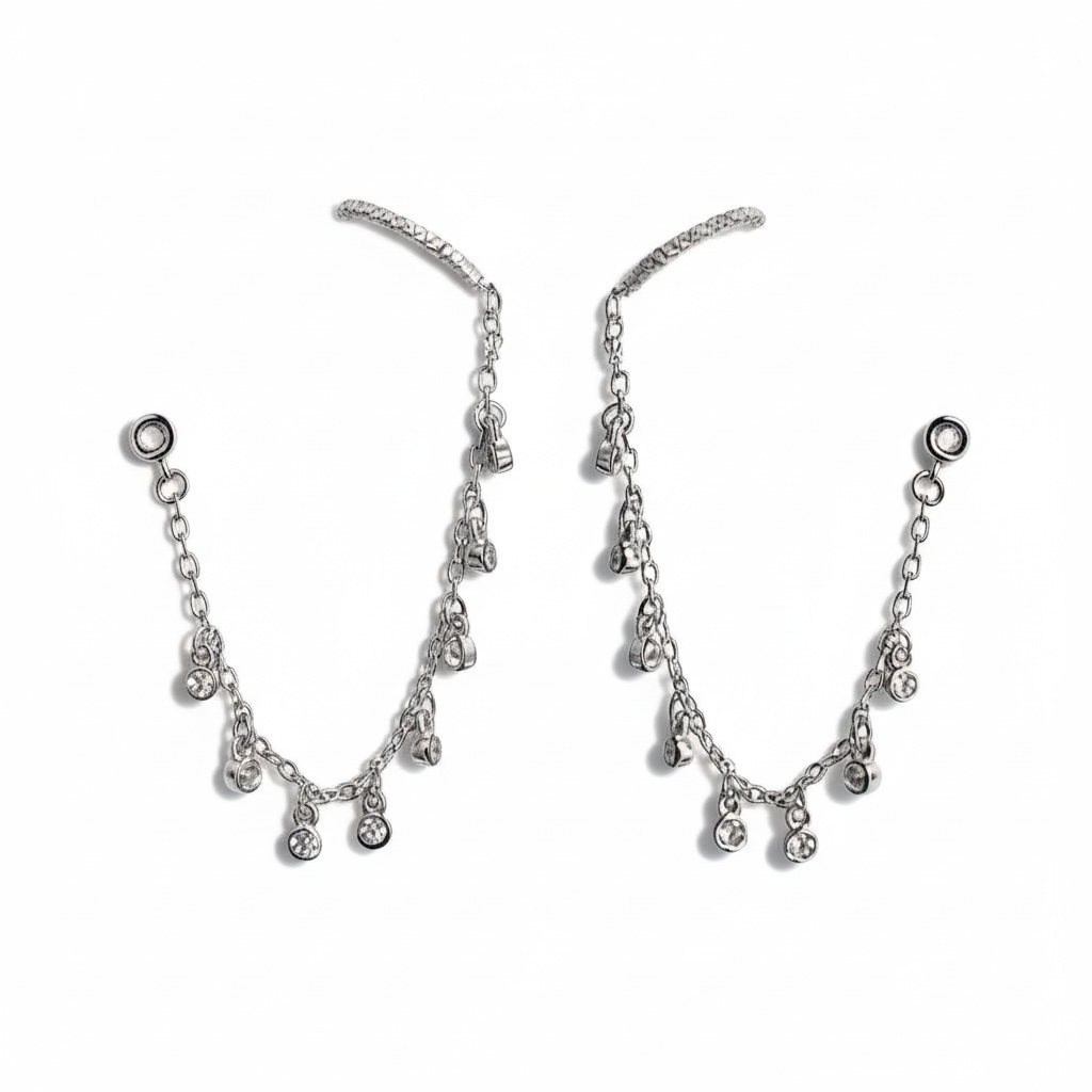 Designed as a seamless blend of an earring and an earcuff, this celestial piece drapes beautifully along the ear with delicate chains and AAA-grade cubic zirconia that shimmer with every movement.